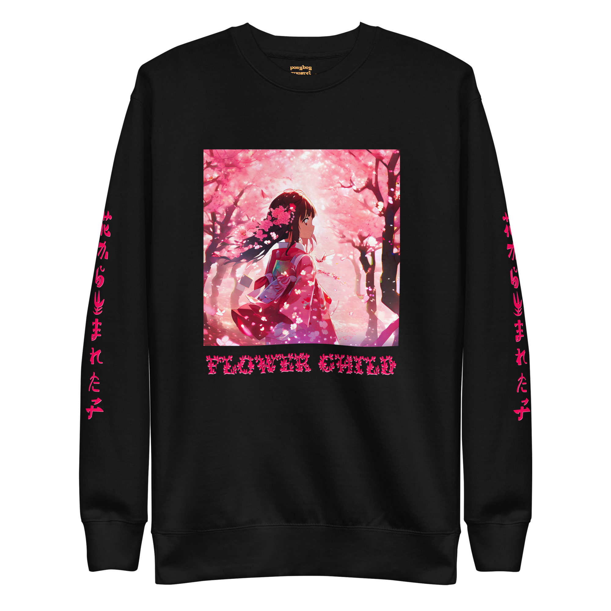 ‘FLOWER CHILD’ SWEATSHIRT — Japanese translation [side-sleeve detail] — “CHILD BORN OF FLOWERS” • 100% cotton face...